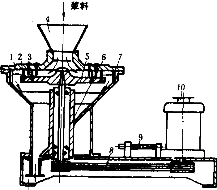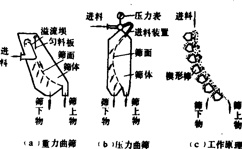 图2 立式冲击磨 1. 定盘; 2. 动柱销; 3. 定柱销;4. 进料斗; 5. 旋转盘; 6. 轴承座; 7. 齿圈; 8. 传动三角带; 9. 调节螺杆;10. 电机 浆渣分离和洗涤设备 利用筛面从淀粉糊浆中筛洗出游离淀粉,使浆渣分离的设备。有振动平筛、回转圆筛或六角筛、离心筛、射流筛、曲筛等。 离心筛 广泛应用于中、小型淀粉厂,适宜各种淀粉原料的浆渣分离。一般由2~5台串联使用,采用糊浆与清水流向相反的逆流洗涤方法。离心筛有立式和卧式之分。其中卧式应用较多,它的工作部件是一个装在密闭的不锈钢罩壳内的圆锥形筛篮,内衬筛网。淀粉糊浆通过中心进料管进入筛篮底部,在离心力作用下,浆液(粗淀粉乳)通过筛孔甩出,汇集到排出口;粉渣沿筛面向锥形筛篮大端移动,连续排出机外。清洗水经喷管喷洒在筛面物料上,将渣中淀粉粒洗出,以提高分离效果。 卧式离心筛的主要参数:筛理面积为0.5~1.5米2,筛篮大端直径为600~1 000毫米,锥角55°~60°,转速700~960转/分,配备动力3~20千瓦。 曲筛 一种静止的高效筛分设备。有重力式和压力式两种喂料方法,它在大、中型淀粉厂得到广泛的应用。重力曲筛[图3(a)]用作浸泡玉米的脱水、胚芽的筛分和洗涤;压力曲筛[图3 (b)]则用于渣浆的分离和洗涤等。重力曲筛和压力曲筛的工作原理基本相同,如图3 (c)所示。操作时湿物料在适当的速度下,从切线方向引向有一定弧度的凹形筛面,物料与筛缝成直角流过筛面,物料流撞在筛条的锋利刃上,被切割分开,淀粉乳通过长形筛缝流入筛箱中,筛上物继续沿筛面下流时被滤去浆液,从筛面下端排出。 曲筛的规格用筛面所包的圆心角来表示,有45°、50°、120°和300°几种。筛面用不锈钢楔形棒条编成,重力曲筛筛棒间隙为0.35~3毫米,压力曲筛筛棒为0.053~0.297毫米。