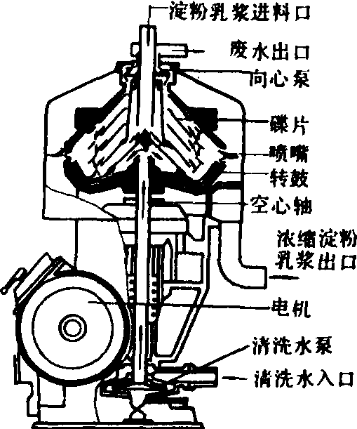 图3 曲筛 淀粉分离与洗涤设备 利用淀粉、麸质和水三者的比重差,借助离心力将其分离的设备。 碟片喷嘴型分离机 用于分离淀粉乳中蛋白质或淀粉洗涤浓缩。其分离原理如图4所示。当淀粉乳进入高速旋转的转鼓中心流向碟片时,在离心力作用下,比重较大的淀粉通过转鼓周围的喷嘴排出,含蛋白质的废水,由转鼓组件上部的专用“向心泵”(亦称撇液盘)排出,可直接送入蛋白质(麸质)浓缩离心机或其他分离机。为了清洗淀粉,转鼓内装有清洗水管,轴的下端装有清洗水泵,清洗水由清洗水泵增压,通过空心轴进入转鼓内的排泄孔,有助于排出含淀粉悬浮多的溶液。分离效率和生产能力决定于: ❶转鼓中液体的浓度; ❷清洗水用量; ❸物料在转鼓中停留的时间; ❹物料温度; ❺喷嘴的大小; ❻转鼓的转速。通常该机小时处理量为15~30米3,转鼓直径为445毫米,转速为4 410转/分。
