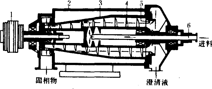图5 旋液分离器 旋流器可组合成澄清型和浓缩型两种流程。澄清型主要产品是轻液,如过程水的处理,回收干物质等;浓缩型主要用于浓缩产品,如淀粉乳浓缩等。 卧式螺旋沉降离心机 一种利用离心力来进行固液分离的机器,简称卧螺。该机在玉米淀粉生产中主要用于麸质、纤维的连续脱水;在马铃薯淀粉生产中用于分离汁水、浓缩淀粉和热凝蛋白的脱水;在小麦淀粉生产中用于A淀粉、B淀粉和麸质的分离、淀粉浓缩和细纤维脱水。 卧螺的结构如图6。工作时,悬浮液通过进料管进入螺旋输送器的加料仓内,经螺旋筒体加速,悬浮液从筒体上的出料孔甩到转鼓内,由于转鼓强大离心力场使悬浮液很快在鼓内分为两层,较重的固相物沉降于鼓壁,形成外环固相层,较轻的液相物形成内环液相层;在螺旋输送器以一定的转速差的推力作用下,固相物料沿鼓壁向转鼓小端移动,由于空腔体积逐步缩小而加速排水,当到达小端出渣孔时已干燥到所需的含湿量,受离心力的作用从出渣口甩出。澄清液在离心力的侧压力作用下,由转鼓大端的溢流环口排出。该机是通过改变喂入量、转速和溢流口的孔径来调整固相物和澄清液的要求。为了避免机器因超负荷而毁坏,在差速器的一端装有过载保护装置。转鼓及其它与物料接触的部件均用不锈钢制作。其主要参数:转鼓直径为160~650毫米,转速2 600~6 000转/分,长径比1.6~3.7,配备功率75~110千瓦,生产能力1.5~90米3/小时。