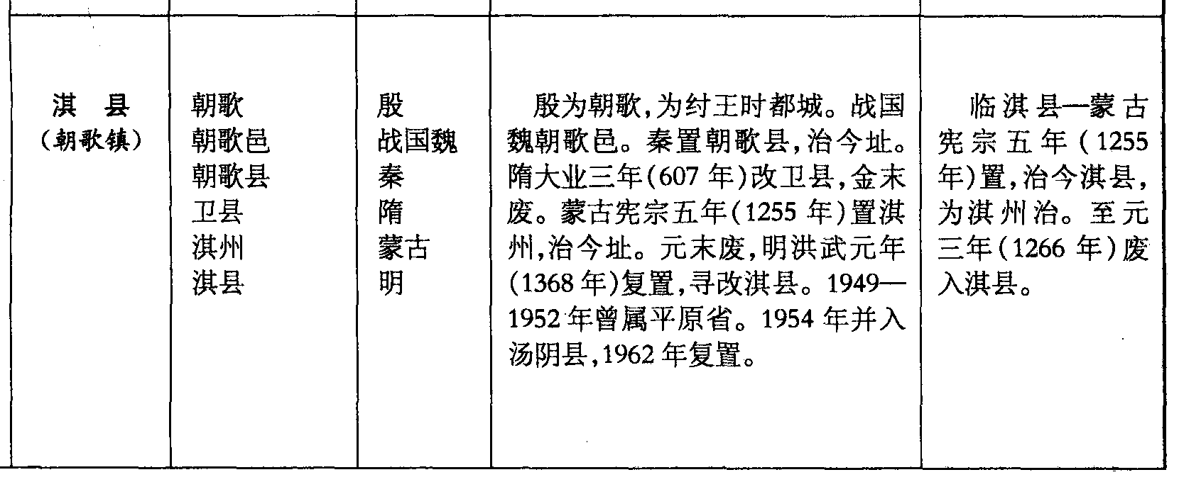 淇县(朝歌镇)朝歌朝歌邑朝歌县卫县淇州淇县殷战国魏秦隋蒙古明殷为朝歌,为纣王时都城。战国魏朝歌邑。秦置朝歌县,治今址。隋大业三年(607年)改卫县,金末废。蒙古宪宗五年(1255年)置淇州,治今址。元末废,明洪武元年(1368年)复置,寻改淇县。1949—1952年曾属平原省。1954年并入汤阴县,1962年复置。临淇县—蒙古宪宗五年(1255年)置,治今淇县,为淇州治。至元三年(1266年)废入淇县。