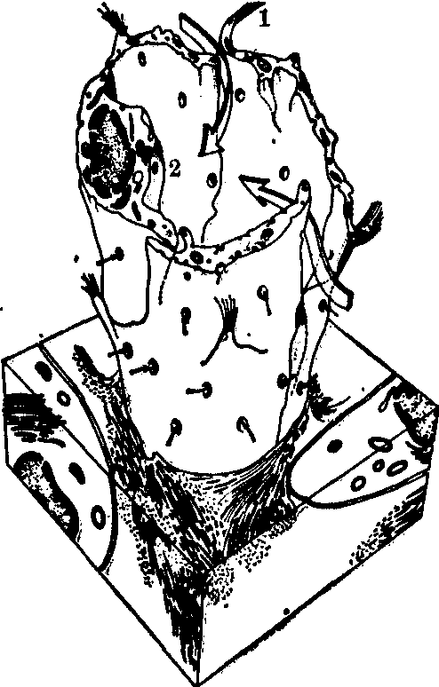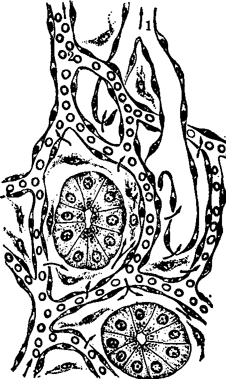 图1 毛细淋巴管和毛细血管的关系 1.毛细淋巴管 2.毛细血管 3.组织间隙