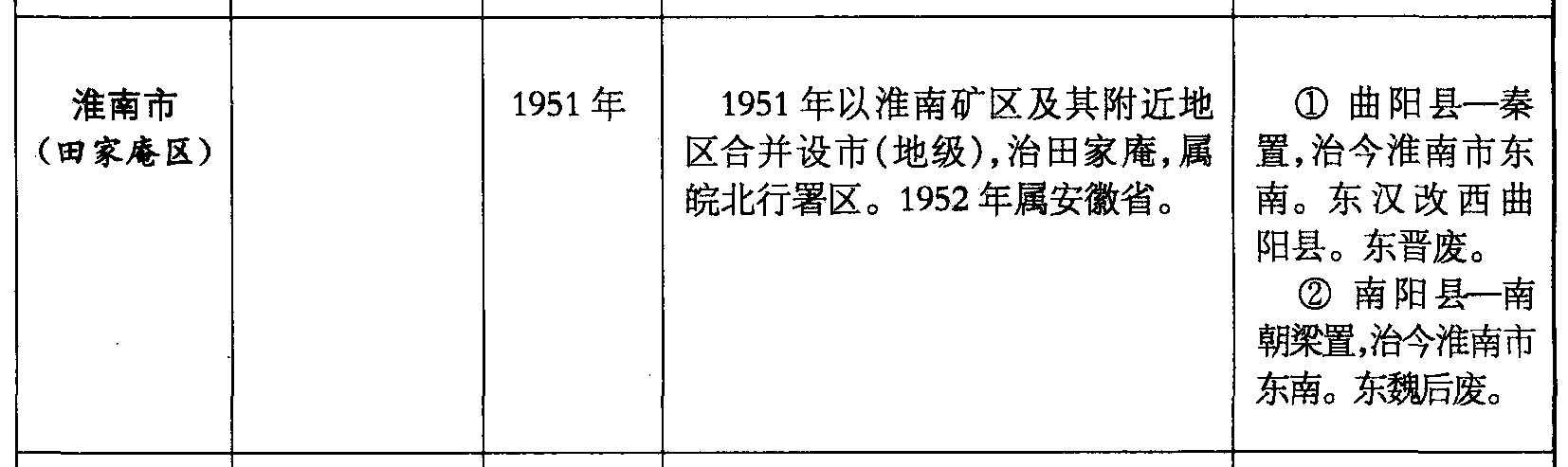 淮南市(田家庵区)1951年1951年以淮南矿区及其附近地区合并设市(地级),治田家庵,属皖北行署区。1952年属安徽省。❶ 曲阳县—秦置,治今淮南市东南。东汉改西曲阳县。东晋废。❷ 南阳县—南朝梁置,治今淮南市东南。东魏后废。