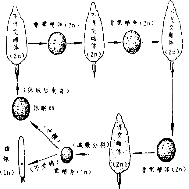 原体腔动物轮虫类的生活史中能产生需精卵的一种雌性个体。轮虫生活史包括孤雌生殖和两性生殖。通常在适宜的条件下行孤雌生殖,雌虫称不混交雌体,产出的卵为夏卵,卵壳薄,为非需精卵(amic-tic egg),染色体为双倍体(2n),可直接发育为下代不混交雌体。但经多代繁殖后,或处于不良环境条件下(如气候较冷),孤雌生殖的不混交雌体就产出经减数分裂的卵,染色体为单倍体(1n),为需精卵(mictic egg),雌性成为混交雌体。此卵若不受精就发育为雄虫(1n),因寿命极短不易看到;受精后的卵就形成休眠卵,卵壳厚,能越冬抗寒,待翌年春季或环境条件好转时,再发育为不混交雌体。