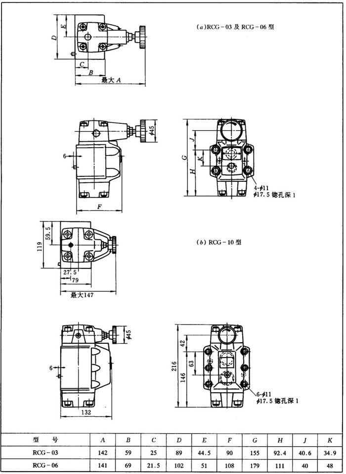 | 释义 | 产品介绍 (1)DR*DP型直动式减压阀(德国力士乐公司) A.型号说明 1-P至A(最小压降);2-A至T(Y)(最小压降);3-只经单向阀的压降;4-经单向阀和全开的主阀芯的压降 1-压降/流量曲线A至Y经单向阀;2-压降/流量曲线B至A;3-只经单向阀的压降;4-经单向阀和阀芯的压降 (B)性能参数 见表:14.7-1。 表14.7-1 DR*DP型直动式减压阀性能参数 1-铭牌;2-调整元件“1”;3-调整元件“2”;4-调整元件“3”;5-去掉钥匙尺寸;6-拔下钥匙新需的空隙;7-阀固定螺钉孔;8-锁紧螺母24对边宽;9-六角调整螺钉10对边宽;10-R形圈9.81×1.5×1.78,用于油口A、B、P、T(Y);11-压力表接口1/4″BSP,深12,六角板手的对边宽;12-无单向阀;13-有单向阀;14-油口B堵死 1-铭牌;2-调整元件“1”;3-调整元件“2”;4-调整元件“3”;5-去掉钥匙尺寸;6-拔下钥匙所需的空隙;7-阀固定螺钉孔;8-锁紧螺母24对边宽;9-六角调整螺钉10对边宽;10-R形圈17.56×2.4×2.62(用于A和B口),R型圈9.81×1.5×1.78(用于Y口);11-压力表接口1/4″BSP,深12,六角板手的对边宽;12-定位销;13-安装面 (2)DR型先导式减压阀(德国力士乐公司) A.型号说明 (B)性能参数 见表14.7-3。 表14.7-3 DR型先导式减压阀性能参数 (B)性能参数 见表14.7-9。 表14.7-9 X型减压阀性能参数 (B)性能参数 见表14.7-12。 表14.7-12 R型减压阀性能参数