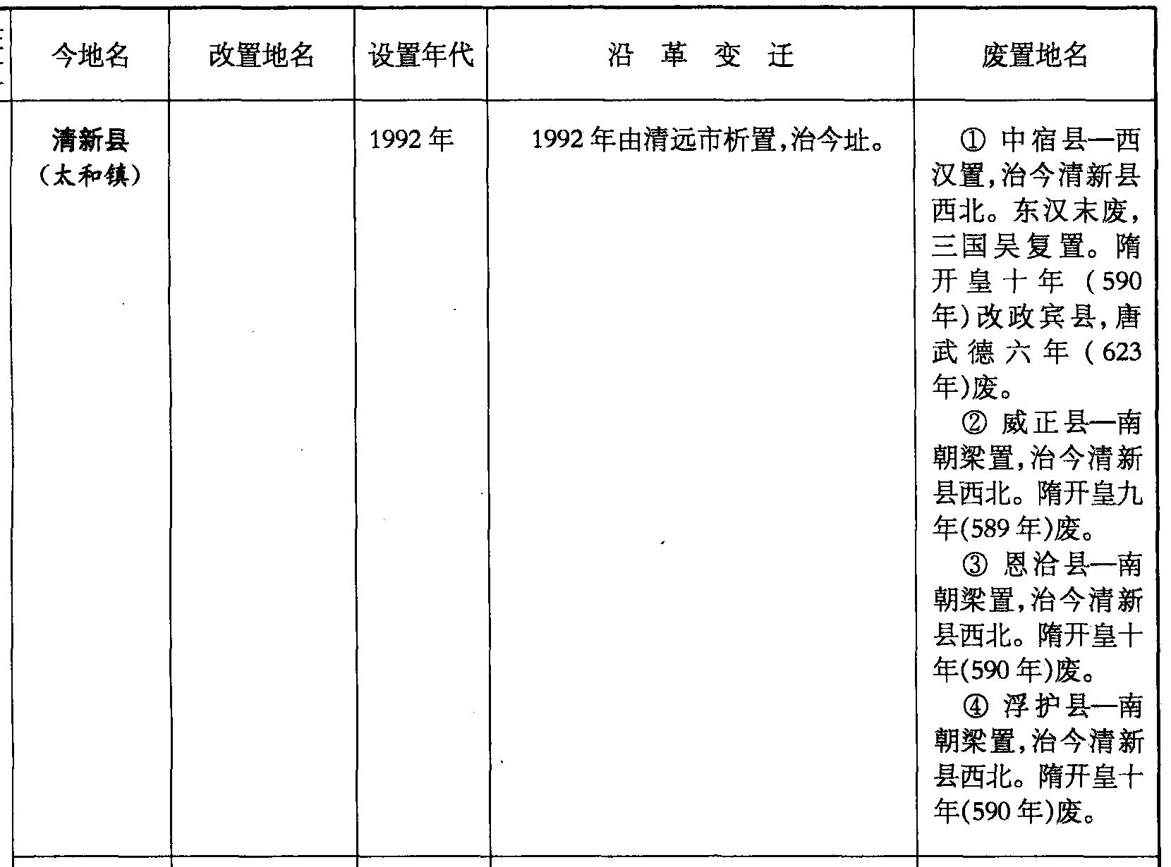 清新县(太和镇)1992年1992年由清远市析置,治今址。❶ 中宿县—西汉置,治今清新县西北。东汉末废,三国吴复置。隋开皇十年 (590年)改政宾县,唐武德六年(623年)废。❷ 威正县—南朝梁置,治今清新县西北。隋开皇九年(589年)废。❸ 恩洽县—南朝梁置,治今清新县西北。隋开皇十年(590年)废。❹ 浮护县—南朝梁置,治今清新县西北。隋开皇十年(590年)废。