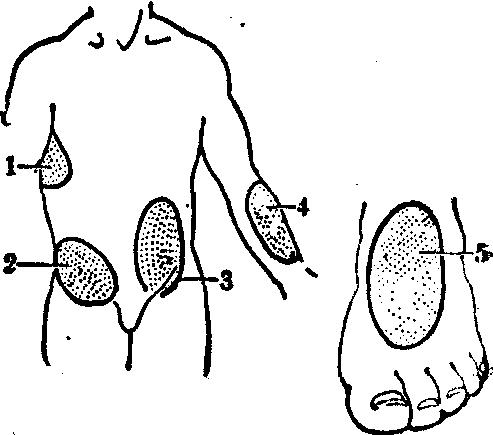 图1 游离皮瓣 游离皮瓣的出现,是对有蒂皮肤移植修复多需分期进行手术的传统方法的一项重大革新,治疗全程可以在一次手术内完成,时间大为缩短,远位移转而无肢体制动的痛苦。游离皮瓣的手术适应证,与一般皮瓣基本一致(见“有蒂皮肤移植术”),早期或后期修复都可适用,特别是在创伤外科的紧急处置中,须以皮瓣修复的缺损,传统方法因创面的形状、部位等条件,必须延迟或间接移转而遇到困难时,游离皮瓣可以提供前所未有的解决途径。但游离皮瓣只能从由直接皮肤动脉供血的解剖部位切取,其面积又受该血管支配范围的限制,且将该血管切断后,在近期内以及远期观察,都不容许对其供血部位造成不良后果。受皮区也须具备适于吻合的相应血管。此外,还须具有显微外科熟练操作的技术素养和必要的设备条件,以及要求术后的严密观察和精心护理,不象传统皮瓣那样比较稳妥和较易掌握。故临床普遍应用受有一定限制,尚不能完全取代传统皮瓣的地位。因此,游离皮瓣应该从严选用,不可避简就繁,要量力而行,不可勉强为之。年龄较大,有血管硬化,或其他血管疾患者,均应慎用或禁用。 施行游离皮瓣手术,血管吻合的技巧如何,常是成败的关键,术中术后的解痉与抗凝措施也颇为重要。 吻合血管,要求准确精细,操作熟练迅速,以求在最短的时间内,接通动静脉,以恢复皮瓣的通畅而充分的血液循环。一般先吻合静脉,后吻合动脉。吻合的条数,动静脉各一条可以基本符合需求,但如条件许可时,增加吻合1~2条静脉,将更有助于皮瓣的血液回流,减轻组织水肿,有利于成活。 任何血管,即使在离体组织中的血管,受到外界刺激时,如手术操作的创伤,环境温度过低,都可发生痉挛,是为生理性保护反应。口径较大的血管发生痉挛,影响可能不大,但在口径较小的微血管,则将直接影响吻合后血流的畅通,与皮瓣移植的成败息息相关。故在手术过程中,应强调严格遵守无创技术操作的重要性,力求动作轻柔,好中求快。术中和术后数日内应保持不低于25℃的室温。在此前提下,适当配合应用扩张血管药物和抗凝药物作为辅助措施。 扩张血管药物,有作用于全身或局部的两类:前者,如罂粟碱、妥拉苏林、烟酸、潘生丁、毛冬青和丹参等。后者,如利多卡因、普鲁卡因、硫酸镁、戊巴比妥等。 抗凝药物常用的有: ❶肝素,供术中吻合血管时局部冲洗之用。也可全身应用,但一般仅限于断指(肢)再植,血管创伤之较广泛者;吻接口径1mm以下血管,技术上遇到困难时;术中曾发生持续较久的血管痉挛,并存在微循环障碍时;皮瓣缺血时间较长;术后发生血管危象,再次吻合得到改善等情况下使用。 ❷低分子右旋糖酐,静脉滴注。可使红细胞、血小板和血管内皮细胞表面的负电荷增加,互相排斥,有降低血液粘稠度,抗血细胞凝集的作用。 ❸阿司匹林,有阻止肝脏对二磷酸腺苷的释放,以抑制其促血小板凝集的作用。与潘生丁有协同作用。游离皮瓣,均以所在解剖部位命名。近年来,经解剖学家和临床医师的不断研究和探索,游离皮瓣的供皮区日渐增加,目前临床应用已有多种,主要的如下(图2)。