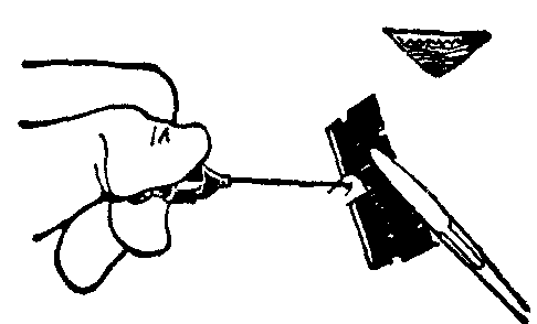 图2 全厚皮片切取法连带皮下脂肪切下,再剔除脂肪。 表层及中厚皮片的切取法,为术者与助手各持木板一块,按压于皮面并向相反的方向牵开,则两块木板间的皮肤即可形成一较实韧平坦而稳定的皮面。用刀长刃薄而锋利的切皮刀或截肢刀,就皮面作往复拉锯样行进动作就可取得皮片。刀面与取皮面所成角度的大小,决定所取皮片的厚度(图3)。此法取皮所需设备简单,如用皮面积不大,也可用安全剃刀片切取。