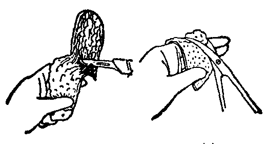图1 点状皮片切取法 全厚皮片的切取法,因切取的全厚皮片的大小和形状须与受皮创面基本一致,以保持移植后原来的皮肤张力不变,始易于成活,故取皮前,应先用布片或薄塑料膜剪制受皮创面的样型,然后依样切取。有两种切取法,第一种是顺真皮与皮下脂肪间的自然解剖层次直接切剥取下,如见创面基底呈现白色纤维结构的网格状,格中皮下脂肪组织隐约可见时,即为切取的层次恰当。此法切取较快,出血亦较少。第二种是先连带皮下脂肪一起切下,再用剪刀将脂肪逐步剔除。此法较费时间,对皮片创伤也较大(图2)。