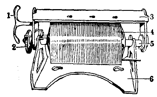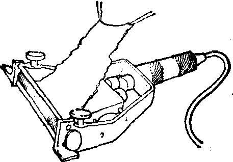 图4 滚轴式切皮刀 切皮机,首先由Padgett和Hood于1939年共同研制成功,即鼓式切皮机,也称Padgett-Hood切皮机。这一创造性的设计,较好地克服了手工切皮法的缺点,开拓了切皮机械化的途径。其后,不同类型的切皮机相继出现,如吸引式、电动式、风动式切皮机等,但直到目前仍以鼓式切皮机的应用最为普遍。 鼓式切皮机的构造,由机座和机身两个主要部件组成。机座为载负机身的支架,并可固定机身鼓面。机身由鼓面、手柄、横轴、刀架、刻度盘等组成(图5)。切皮机有大小两型,大型鼓面长20cm、宽10cm,小型鼓面长20cm、宽8cm。使用时,将刀片固定在刀架上,借涂布在鼓面和供皮区皮面上的胶液将皮肤粘起,乘势落刀即可开始切割。切下的皮片,由刀刃与鼓面间可以调节的缝隙中穿出,真皮面朝外粘着在鼓面上。缝隙的宽度即所取皮片的厚度,可经由刻度盘控制。刻度盘上的每格代表0.01 mm,但实际厚度还受切取者的手法,刀片的利钝,切皮机的灵敏度等因素的影响而有所出入,不完全决定于刻度盘的标定数值,故切皮开始后,尚须观察所取皮片的实际厚度随时调整。切皮的操作,大致可以分为备鼓,涂胶,粘皮,起刀,切皮,割断等步骤。如能掌握要领操作熟练,可以取得与鼓面面积相同,厚度均匀,边缘整齐规则的大张皮片。为简化涂胶步骤,可用专供取皮用的两面胶胶膜,粘在鼓面上,供皮区即不用再涂胶液,所切下的皮片即裱褙在胶膜上,可连同胶膜一起取下,既易于操作,也可保持皮片的张力和形状不变。鼓式切皮机,尚可用以连续切取,取得超过鼓面长度或宽度的皮片,如L形或T形等皮片(图6)。还可自离体的包含皮下组织的皮肤上削取皮片,或将较厚的皮片再劈分为表层皮片和真皮片两层等多种用途。