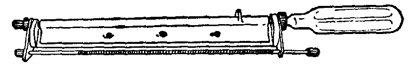 图3 表层及中厚皮片的手工切取法 手工取得的皮片,上下边缘多不整齐而呈锯齿状,宽度也往往不足,厚度也难均匀一致,影响植皮效果。这种取皮方法还受解剖部位的限制,如在松软而滑动的腹壁操作即感困难。且此种取皮法由于所取皮片较窄,边缘不齐,以致不能充分利用供皮区可以提供的可用面积。 机械切取皮片的方法,是借助切皮的专用器械,按标定的厚度数值切取大面积整张表层或中厚皮片的方法。皮片的厚度以0.01mm为计算单位。皮肤全层的厚度,因年龄、性别、部位等的不同而有差异,故各种皮片厚度的确切数值也不固定。一般成人的参考数值是: 表层皮片为0.2~0.25mm,薄的中厚皮片为0.3~0.45mm,厚的中厚皮片为0.55~0.65mm。切皮器械中,有构造较简单的滚轴式切皮刀,和较复杂的各式切皮机。 滚轴式切皮刀,又称Humby切皮刀,是具有滑动的滚轴和附有调节切皮厚度装置的较简易的切皮器械。调节制定厚度的旋钮,每格代表0.25mm的切皮厚度(图4)。切皮的操作,与使用一般手工切取时的切皮刀相仿,但较易掌握,可按预定数值取得厚薄均匀的皮片。但此法仍有切取的皮片上下边缘不齐,宽度往往不足,受解剖部位限制,以及不能充分利用供皮区的有效使用面积等缺点。