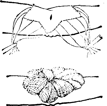 图7 电动切皮机 无论是经手工或机械切取的皮片,如暂时未及使用,应以生理盐水纱布包裹,并放入专用容器内,以防干燥,但不应浸入生理盐水内。 供皮区创面的处置 与在受皮区植皮同样重要,不可忽视。具体处置方法因所取皮片的厚度、种类,以及气候、地区等的差异而有所不同。如全厚皮片切取面积较大,其供皮区创面超出可以直接缝合的限度时,须另取较薄皮片移植闭合。非全厚皮片、点状皮片、筛状皮片等的供皮创面,通常采用单纯或含有抗菌药物的细密油制纱布1~2层覆盖,以保护源于残留腺体及其导管和毛囊等的较脆弱的新生上皮,其外方再施以较厚的松软敷料加压包扎。夏季气候炎热和过于潮湿易发霉的地区,可于术后2~3天将外层敷料除去,只保留紧贴创面的油制纱布,并促其干燥,这称为半开放法。但仍以包扎法最为常用和可靠。 受皮创面的准备 是保证移植皮片顺利成活的重要环节。如何妥善准备或选择适当时机,则视其为无菌或感染创面而定。 新鲜无菌受皮创面的准备要点,在于仔细认真的止血,因术后继发出血形成血肿往往是植皮失败的最常见原因。毛细血管渗血应以压迫法止血为主。断裂的血管应以细白丝线结扎为主,结线所留线头须尽量剪短,以减少异物反应。一般不采用电凝法止血。肾上腺素稀释液压敷也宜慎用。创面内如有不超过1×1cm面积大小的无血区,如失去腱旁组织的肌腱,无骨膜或软骨膜被覆的骨或软骨面,该部皮片仍可由“跨越现象”而成活。如大于此面积时,则须设法利用邻近软组织的有蒂移植移转遮覆后,再行植皮。如裸露面积过大,即非属皮片移植的适应证。新鲜污染创面的准备,除需清创外,其他与无菌创面要求相同。 陈旧感染创面的准备要点,在于培育较好的肉芽创面。为此,须从清除坏死组织,保持引流通畅,勤于更换敷料,控制细菌感染,适当加压包扎,和抬高肢体消除组织水肿等措施入手。至肉芽色泽红润,组织致密平坦,易出血,无水肿,分泌物不多,四周创缘无炎症现象并见有新生上皮出现时,施行皮片移植的条件即告成熟。植皮时,可将肉芽组织削除,如肉芽平薄也可保留。 皮片的移植和固定 是皮片移植术的最后操作步骤,也是保证皮片成活的另一重要环节。受皮创面经过细心充分准备后,移植的皮片又得到稳定可靠的制动,才能使皮片与创面间及时建立血运而成活。移植和固定的方法,因受皮创面的性质和解剖部位等的不同而异。一般以大张皮片移植缝线包压法应用最广,加压包扎法次之。此外,还有不甚常用的内嵌、外嵌、开放、重叠、种子、延期等植皮法。四肢关节等部位植皮,还常需外用石膏绷带制作的托板辅助制动,以使固定更为稳妥。 缝线包压法,又称打包法、包堆法、缝扎法、缝合压力敷料法等。普遍用于无菌或污染创面的大片整张植皮,感染创面通过精心准备,培育出良好的肉芽组织后,如行大张皮片移植时也可采用。其法,为将皮片与受皮创缘相缝合时,每隔数针留长线一条备用。移植全厚皮片,须注意按样型所示形状方位与受皮创面准确对合。移植非全厚皮片,注意随创面形状和创缘走向适当剪裁,以保持皮片松紧适度接近其原来的张力,和与受皮创面自然地密切贴合。如创面凸凹不平,为避免凹处皮片漂浮,应加用贯穿皮片并缝连基底创面组织下垫小团纱布结扎的绷线缝合。绷线缝合还于需要加强制动或减少包压敷料的厚度时用之。缝合毕,细心排除皮片下的积血或气泡,必要时尚可在皮片上刺穿多数小孔以利引流。然后用以生理盐水浸过的大网眼细纱布蓬松均匀地堆置于皮片上,注意妥贴填实。最后将缝合创缘时所留长线互相对应结扎(图8)。缝线包压法可以保持皮片与受皮创面间稳定而密切的接触,其外方再覆以多层纱布或棉垫加压缠扎。