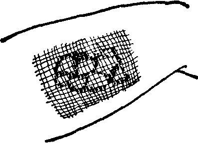 图8 缝线包压法 加压包扎法,多于肉芽创面行小块皮片,如点状或邮票状皮片等移植时用之,不用缝线固定。小块较厚皮片易朝真皮面卷缩,移至创面上务须注意展平。移植毕,用单层大网眼细纱布覆盖,将纱布超出创面边缘的部分用胶液与该部皮肤粘住。然后用生理盐水大网眼纱布蓬松地散置其上,加压包扎(图9)。初换敷料时,用生理盐水将外层敷料充分湿透后,缓缓小心揭除,以免皮片错动,影响成活。此外,加压包扎法也可用于某些部位无菌创面的植皮,例如在手、脚部,敷置较厚敷料加压包扎,所植皮片即稳定而不易移位。此法不需预留长线结扎,与缝线包压法相比,可以缩短手术时间。