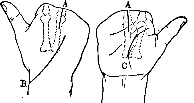 图1 再造中指时的手部皮肤切口 内,显露头静脉、手背静脉、桡动脉、指总伸肌腱、桡神经浅支。在A、B切口之间的皮下形成一较宽的隧道,以容纳趾血管、趾伸肌腱与趾背皮神经 (足背内侧皮神经) 通过。❸在切口C内,显露中指的指屈肌腱、两根指神经或指总神经,以及同名血管。 ❹第2趾移植于中指部位后,使其略向拇指方向旋转,以利对指。 ❺趾血管与桡动脉、手背静脉在鼻烟窝附近缝接。 ❻趾伸肌腱与指总伸肌腱缝接,趾深屈肌腱与指浅或指深屈肌腱缝接。 ❼趾神经分别与指神经缝接。