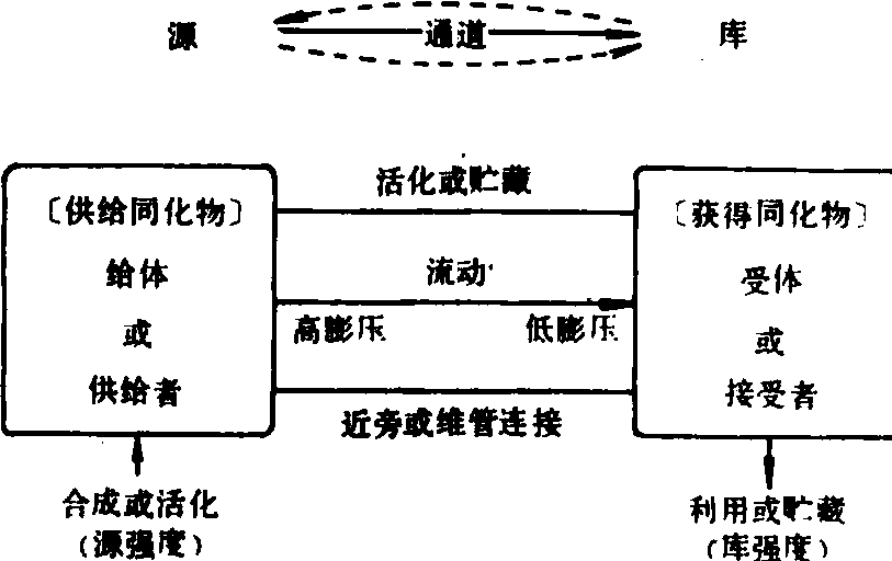 | 释义 | 源—库关系source-sink relationship源和库在控制整个植株同化物的运输和分配方面的密切关系。“源”是指产生或供应有机物的器官或组织。如成长的叶子,或植株绿色部分,它们制造并供应其他器官同化产物。“库”是指消耗或贮存同化物的器官或组织。如幼叶、茎尖、根、种子、果实、块根、块茎等。源与库通过维管组织相互联系。其本质特性是由它们输出或输入同化物的能力所决定(图)。库对源有反馈作用,能调动源内有机物向其转移。运输流畅是指输导系统内液流畅通,是以源端物质的不断输出和库端的及时利用和贮备为前提。如果库端不能充分容纳与利用源端的同化物时,则同化物不能及时从通道上部卸出,源端同化物的供应及继续合成过程就会减弱,引起反馈抑制,使光合作用降低。