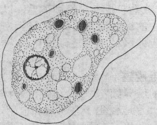 | 释义 | 溶组织内阿米巴entamoeba histolytica寄生于人体,可引起阿米巴病。分滋养体和包囊两期。滋养体大小不一,以直径15~30μm为常见。体分内质和外质,内质呈颗粒状,常含有被吞噬的红、白细胞;外质透明,不时伸出伪足,运动活泼。包囊为直径5~20μm的球形小体,随宿主的粪便排出体外,被人吞食后经胃到达回肠,虫体脱囊而出,经分裂繁殖变为很多的滋养体,寄生于大肠肠腔或其壁内。在当大肠下段粪便干结时,滋养体即形成包囊(图)。
