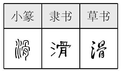 【提示】骨,9画,上面内部是横折,起笔与左边相接;旧字形10画,上面内部是一横、一竖,起笔与右边相接。 下面是⺝, 起笔是竖,不是撇。月,单独位于字或部件下面时,起笔的撇改竖; 中间两横宋体与左右两边相接,楷体与左边相接,与右边相离。 *滑huá12画 水部 (1) 光溜;摩擦力小: ~溜|光~|冰上很~|~润。 (2) 在光滑的物体表面迅速移动: ~冰|~雪|~行|~翔。 (3) 蒙混过去: 证据确凿,休想~过去。 (4) 不诚实;狡诈: ~头|耍~。 滑 ☚ 滿 澤 ☛ 滑huá战国以来的形声字。从氵(水),骨声。声变如葛喝、干汗例,韵变如孤瓜、吾衙例(古代又读gǔ,乱,扰乱义)。指滑溜,光溜,不粗涩。如下雪后路滑。组词如:光滑|滑溜。引申为在光溜的物体表面上溜动。如:滑冰|滑了一跤。组词如:滑翔。引申为狡诈,不诚实。如:滑头|这人很滑。组词如:狡滑。或作猾。又引申组词如:滑稽(诙谐,使人发笑)。 滑★常◎常