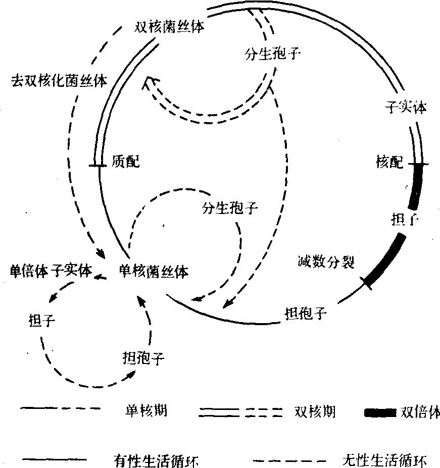 图 1 滑菇 滑菇子实体丛生,菌盖表面有一层极粘滑的粘胶质,表面黄褐色,中部红褐色,无鳞片。直径2.5~8.5厘米,初扁半球形,开伞后平展或中部稍凹。菌肉浅黄色。柄中生,圆柱形,有时基部稍膨大,黄色,内部松软,长5~7厘米,粗5~10毫米。菌环黄色,生于柄的上部,易消失。菌褶直生,初白色,后变黄色至灰褐色,菌褶宽、密,常呈波状。有缘囊体(图1)。孢子椭圆形,表面光滑,外被粘性物质,4.5×2.5~3微米,孢子印深棕色。 主要生活史为单核担孢子 单核菌丝 双核菌丝 双倍体核 担孢子。除此以外,还有几个生活小循环(图2)。