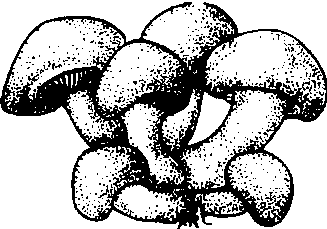 图2 滑菇生活史 菌丝生长温度8~32℃,最适生长温度24~26℃。子实体发生温度为6~20℃,适温10~20℃。滑菇有早生型、中生型、晚生型几个品系。早生型要求温度较高,晚生型要求较低,中生型居中。每一品系之间的温度差为2~4℃。子实体生长需要充分氧气,二氧化碳过多会抑制菌盖形成,要求90~95%的空气相对湿度及散射光,无光不能形成子实体。 滑菇栽培有普通菇木栽培、菇木覆上栽培、短菇木覆土栽培和木屑栽培等几种方法。❶普通菇木栽培。适宜树种为壳斗科(Fagaceae)和械树科(Aceraceae)树木。冬、春季砍下,截成1米长的段木,先在段木上钻接种穴,随即接入菌种,保温发菌。菌丝完全定植后,将菇木移于阴凉地上平放。一年后,菇木中菌丝充分生长。当气温降至16℃以下时,子实体开始发生; ❷菇木覆土栽培。方法同前,不同的是菌丝充分生长后,将菇木埋于土中,到出菇季节,除去覆盖的土,盖上禾草,保持湿润,满足出菇条件,使子实体大量生长; ❸短菇木埋土栽培。菇木长20~30厘米。接种时在菌种中混入50%的木屑、米糠培养基,涂于菇木端面,将两根菇木的端面密接,扎牢,覆盖发菌,菌丝在菇木上定植后,将2/3菇木埋于土中,菇木周围用塑料薄膜或草帘等做成荫棚,保持荫凉的环境; ❹木屑栽培。采用木屑、米糠培养基,将培养料装入布袋中,在100℃,8小时或126℃、2小时的条件下灭菌。趁热将培养料倒入内衬塑料薄膜的木箱中。料温降至35℃以下时接种。在25℃左右发菌。秋季温度适宜时揭去薄膜并注意保湿,即陆续出菇。中国东北地区用木屑培养料栽培,2月至3月接种,9月至10月采收。 滑菇nameko mushroomPholiota nameko(T.Ito)S.Ito et Imai,又称光帽鳞伞、滑子蘑、珍珠菇。中国北部栽培的主要食用菌之一。丝膜菌科,鳞伞(锈伞)属。菌盖初半球形,后平展,淡黄至黄褐色,中央色较深,盖面有黏液。菌肉淡黄色。菌褶密,宽,不等长,延生或弯生,白或黄色。菌柄中生,圆筒状,内部充实或稍中空,柄具薄膜质的上菌环,易消失,菌环以上的柄淡黄褐色,以下色深,有黏黏液和黄褐色鳞片。担孢子椭圆至卵形,5~6μm×2.5~3μm,肉桂色。秋季生于壳斗科等阔叶树的砍伐后的根部和倒木上。中国主要分布于黑龙江、广西、台湾等省区,商业性生产始于1977年。味鲜嫩滑。