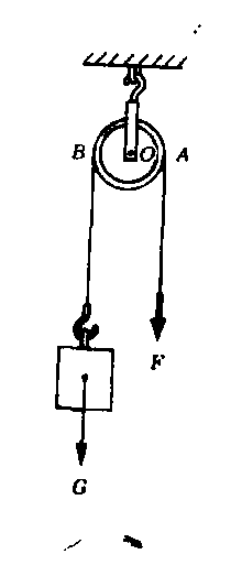 定滑轮 转轴位置固定不动的滑轮,叫做定滑轮。定滑轮实质上是一个等臂杠杆,支点O在滑轮中心,半径OA、OB分别为动力臂和阻力臂,根据杠杆原理,动力F与重力G的大小相等,即F=G(将重物换为砝码,在过滑轮绳的下端系上一弹簧秤,由弹簧秤的读数也能验证此结论)。由此可见,使用定滑轮不能省力,但可以改变作用力的方向,有利于改善劳动条件。转轴位置随起吊重物一起移动的叫动滑轮。动滑轮可被看作是不等臂的杠杆,绳索与滑轮边沿的接触点O为支点,OA为动力臂,OB为阻力臂,根据杠杆原理,有F·OA=G·OB,或F=1/2G,即动力F等于重力G的一半(同样可用弹簧秤验证此结论)。由此可见,使用动滑轮可以省一半的力,但是它不能改变作用力的方向。由图还可以看出,重力G平均分担在吊着动滑轮的两股绳子上,如果忽略动滑轮的重量,则每股绳子只承担物体重量的1/2。