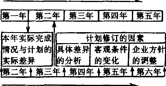 在计划执行过程中,随着时间的推移而不断地调整和重新编制计划的一种方法。可用于编制长期、中期、短期计划,如编制1991—1995年的五年计划,1991年底根据本年计划的执行情况及其有关环境的变化,重新调整和编制出1992—1996年的五年计划。一般来说,考虑前一年要较细、较具体,后四年则应较粗、较概略。如此类推,运用此法也可编制季度计划。如图示: