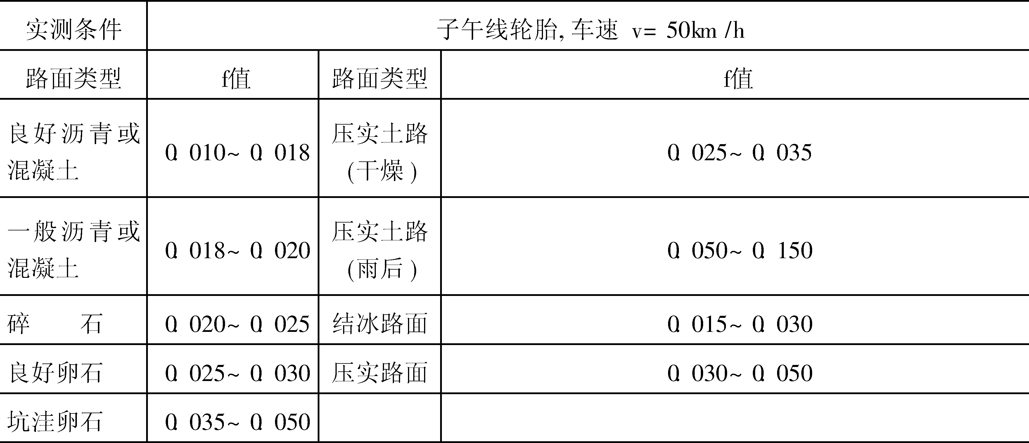 道路状况与滚动阻力系数f值(实测)