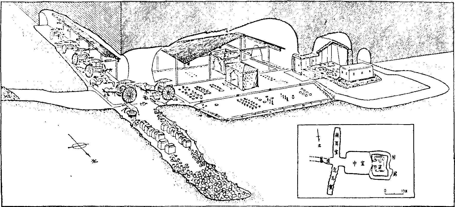 刘胜墓墓室内部 ☚ 地主田庄 金缕玉衣 ☛ 满城汉墓 满城汉墓西汉中山靖王刘胜墓及王后窦绾墓。位于河北省满城县西南陵山上。于1968年发掘。两墓并列开凿在山岩中,为规模宏大的崖洞墓。刘胜墓全长五十一点七米,窦绾墓全长四十九点七米。两墓的形制和结构相似,均分为墓道、甬道、南耳室、北耳室、中室和后室六部分。中室和后室之间装有石门,墓道口先用土坯或砖砌筑,再浇灌铁水铸成铁门。刘胜墓的甬道、南北耳室和中室,窦绾墓的中室,均建有瓦顶木构房屋。两墓后室则是在洞内用石板筑成石屋。墓内各室分门别类地放置随葬品。刘胜墓的南耳室象征车马厩,放置车六辆,马十六匹,狗十一只,鹿一只。北耳室象征仓厨、磨房,放置大量陶器,还有石磨和推磨的牲畜遗骸。中室模拟饮宴待客的厅堂,中部张设两具帷帐,四周摆满了鼎、釜、甗、钟、罍、壶、 𫔴、盆、灯、熏炉等大量铜器,各种铁器、金银器、漆器、玉石器、料器、陶器和五铢钱、侍从俑等。还有象征出行时用的小型偶车马仪仗。后室象征卧室,除放置棺椁外,还有许多精美的铜器、漆器、玉器及兵器、五铢钱、金饼、侍从石俑等。附属于后室的小侧室象征浴室,内置盆、罍、灯、熏炉等铜器,还有一块搓澡石和一个石男仆俑。整个墓室完全模拟墓主生前所居宫室。窦绾墓内布置情况与刘胜墓大体相似,只是随葬品数量略少。刘胜墓葬具为一椁一棺,髹漆棺椁置于后室内汉白玉石的棺床上。窦绾墓葬具只有一镶玉漆棺,漆棺内壁用一百九十二块玉版镶嵌,外壁镶嵌玉璧二十六块。刘胜和窦绾均以金缕玉衣作为殓服。刘胜的玉衣由二千四百九十八块玉片组成,所用金丝约一千一百克;窦绾的玉衣由二千一百六十块玉片组成,所用金丝约七百克。两墓随葬品非常丰富,共有四千二百多件。其中最为精美的是铜器,如鎏金银镶嵌乳钉纹壶、鎏金银蟠龙纹壶、错金银鸟篆文壶、错金博山炉、鎏金“长信宫”灯、错金嵌绿松石朱雀衔环杯等,均属汉代青铜工艺之精华。在经过分析检验的部分铁器中,有低碳钢、中碳钢和百炼钢制品,还有固体脱碳钢制品。另外,还出土了用于针灸的金、银医针和用于计时的铜漏壶等。由于这两座墓规模巨大,保存完整,年代明确,并首次出土了完整的金缕玉衣,不仅为研究汉代诸侯王贵族的丧葬制度有重要价值,而且为研究汉代的冶炼、铸造、制玉、漆器、纺织等手工业和工艺美术发展情况提供了重要资料。 ☚ 马王堆汉墓 广州南越王墓 ☛ 满城汉墓西汉中山靖王刘胜及其妻窦绾墓。位于河北省满城县陵山上,1968年发掘。该两座墓建在陵山主峰靠近山顶处,为南北并列的夫妇并穴合葬墓。墓室在山崖中开凿出来,墓口以土坯或砖砌筑,再以铁汁浇灌封门。两墓共出土文物4200多件,种类有陶器、铜器、铁器、金银器等。铜器“长信宫”灯是汉代罕见的艺术珍品。其造型为宫女跪坐持灯状,通体鎏金,有可转动的灯盘和可以开合的灯罩,能调整灯光的射向和强弱。墓葬中还出土了两套完整的金缕玉衣,这是中国有准确纪年的最早的玉衣。 满城汉墓西汉中山靖王刘胜及其妻窦绾墓,位于河北省满城县陵山上。1968年,中国科学院考古研究所和河北省文物工作队进行发掘。这两座墓位于陵山主峰东坡接近山顶处,南北并列,属夫妇并穴合葬,即“同坟异葬”。墓为崖墓,刘胜墓全长57.7米,最宽处37.5米,最高处6.8米。窦绾墓全长49.7米,最宽处65米,最高处7.9米。两墓形制结构大体形同,由墓道、甬道、南、北耳室、中室和后室六部分组成。中室和后室有石门相隔。墓道口刘胜墓用土坯,窦绾墓用砖砌筑,再以铁水烧灌封门。刘胜墓的甬道、南北耳室和中室,窦绾墓的中室,原在岩洞内还建有瓦顶木构房屋,但早已腐朽坍塌。两墓的后室,包括放置棺槨的主室和一个象征浴室的小侧室,均系在岩洞中修建的石屋。两墓内均设置完整的排水系统。两墓各洞室的顶部,均作拱形或穹窿顶,周壁为弧形,墓洞基本保存完好。在陵山顶上还发现当时用于祭祀的祠庙遗迹。刘胜葬以一棺一槨,窦棺墓有棺而无槨。刘胜的髹漆棺槨置于汉白玉石的棺床上。窦绾的镶玉漆棺,装饰颇为特殊,棺内周壁用192块玉镶嵌,棺的外壁镶嵌玉壁,棺盖及左右侧壁各镶8块,前后端均嵌大型玉璧一块,这种内外镶玉的漆棺未见记载,在考古中也属首次发现。刘胜和窦绾均以“金镂玉衣”为殓服。这两套“金镂玉衣”是中国考古工作中第一次发现的保存完整的玉衣,也是准确年代可考的最早的玉衣。两墓墓内各洞室及墓室都放置大量随葬品。刘胜墓甬道和南耳室共置实用车六辆、马十六匹,出土时只存金属的车马器和马骨架;还有十一只狗和一只鹿。北耳室随葬品主要是陶器,其种类和数量都很多,部分陶器内原来还分别装盛酒、粮食、鱼类等。中室的随葬品也很多,主要是铜器、铁器和陶器;室内还设两具帷帐,帐墓和帐架的木质部分已朽烂,只存铜质帐构,后室存放棺、槨以及许多贵重的器物。窦绾墓随葬品不如刘胜墓丰富,而各墓室情况与刘胜墓大致相似,只是车马和陶器的陈放位置同刘胜墓相反。车马放在北耳室,共有四辆车、十三匹马,陶器则置于南耳室,室内有七道砖墙,形成六个小间,以存放随葬品。中室的西北部也有一些砖砌的矮墙,西南部则筑一方形夯土台,随葬品主要出土于中室的南部和这个夯土台上。后室