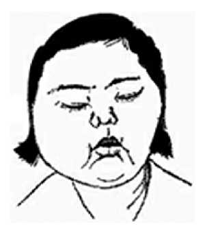 为库欣(Cushing)综合征及长期应用肾上腺皮质激素患者的特异性面容。表现面圆如满月、面色红润,女性病人头发稀疏、生胡须、伴有痤疮。见于皮质醇增多症(Cushing 病)及长期应用肾上腺皮质激素者。