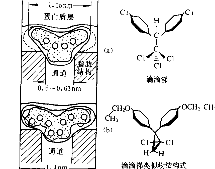 霍兰(G. Holan,1969)对上述受体部位模型加以改进,推广到解释几种滴滴涕类似物的杀虫活性。图2中表明滴滴涕和对-乙氧基类似物[1,1-(对-乙氧基)2,2-二氯环丙烷)在受体部位中的模式。这两个化合物对家蝇的毒性相等,应同样适合于受体部位。图2a的虚线表示受体部位对苯环上取代基的限制,实线表示对负性原子偶极子上取代基的限制,图2b实线表示对负性原子偶极子的温德华(van DerWeal)引力的限制。因此这两个化合物与霍兰模式相吻合,而且滴滴涕及其类似物能分布在脂—蛋白神经