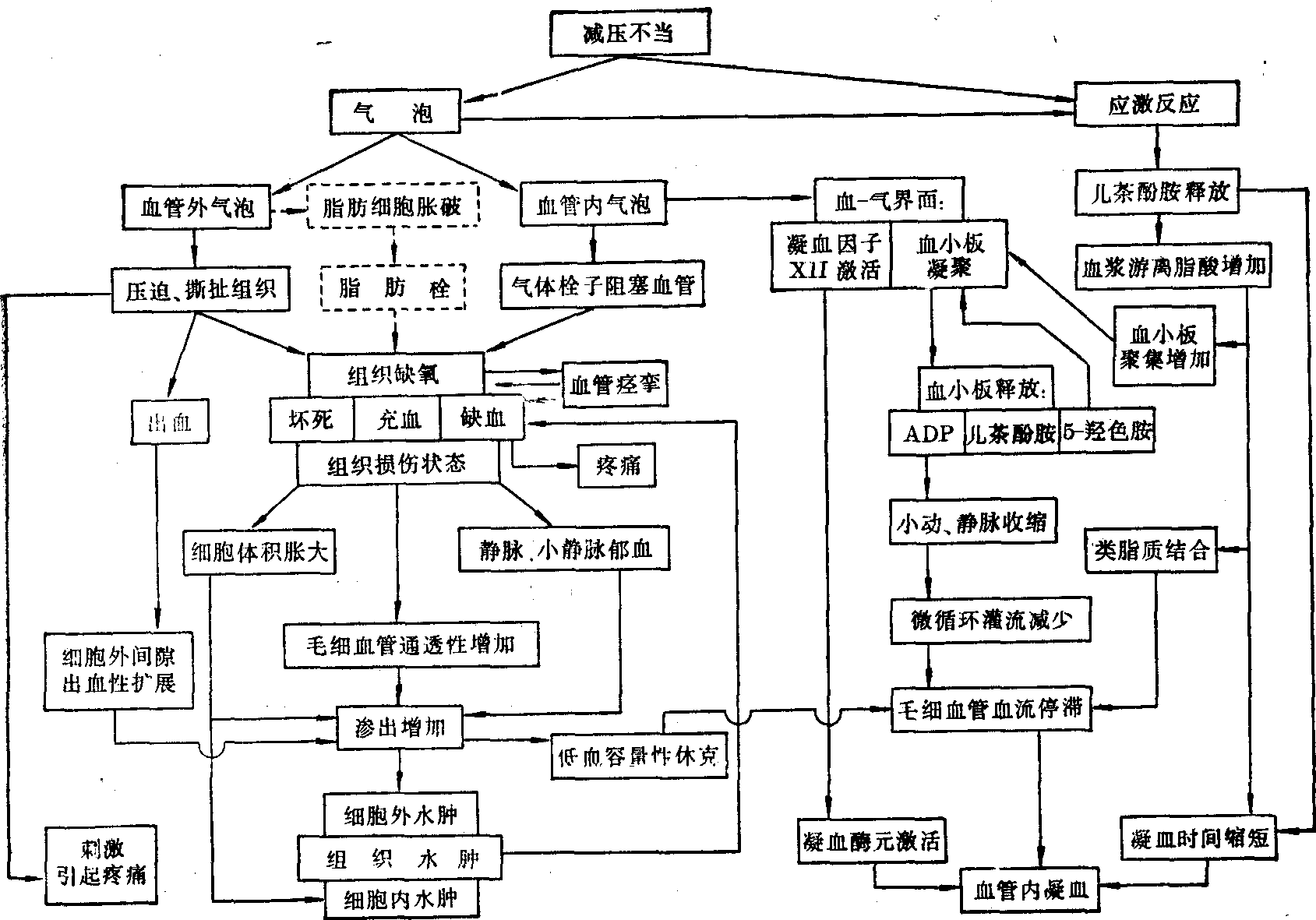 (注:虚线表示在潜水减压病中不常见) 减压不当形成气泡和所引起应激反应及其后果示意图 循环系统 在血管与心腔中积有大量气泡时,可能出现发绀、脉细数、四肢发凉、心前区狭窄感。叩诊时往往发现心界向右扩大;听诊有类似心瓣膜闭锁不全杂音。由于气泡移动,症状可出现好转与恶化交替。毛细血管广泛地被小气泡栓塞时,通透性增加,血浆大量渗出,血液浓缩,导致低血容量性休克。气泡累及淋巴系统时,可造成局部浮肿和淋巴结肿痛。气泡与血液的界面作用可促进凝血,进一步加重栓塞; 如果广泛地发生在微循环区域,形成播散性血管内凝血,病情更为严重。心脏冠状动脉被栓塞,可造成猝死。 呼吸系统 肺血管被气泡广泛栓塞且伴有肺水肿时,有胸部压迫感、胸骨后突发性灼痛和不可抑制的阵发性咳嗽,深吸气或吸烟时更甚,呼吸困难、憋闷呛咳,称为“气哽(Chokes) ”。听诊有湿罗音。若肺边缘部位有相当大的栓塞,叩诊可发现浊音。 腹部脏器 肝、脾和泌尿系统有少量气泡时,很少表现症状; 有大量气泡时,会引起这些器官的功能障碍和衰竭。大网膜、肠系膜及胃血管中有气泡时,可发生恶心、呕吐及上腹部急性绞痛。腹痛有时与脊髓受损并发。有的潜水员在潜水结束后发生与体力劳动不相称的极度疲劳感,有不可克制的睡意,并久睡不醒,可能与肾上腺皮质受损或5-羟色胺释放过多有关。 减压病的症状和体征以关节和肌肉疼痛为多见 (约72%),皮肤症状次之(约14%),中枢神经系统又次之(约10%),呼吸、循环系统最少(约4%)。 临床分类 根据症状和体征的部位、程度和对机体影响的严重性的不同,可将减压病分为两型:仅有皮肤瘙痒或(和)肢体疼痛者为轻型(Ⅰ型); 有其它临床表现者为重型(Ⅱ型)。 根据减压病病症存在时间的长短和(或)发病及病症发展的快慢,可分为急性减压病和慢性减压病。急性减压病是指致病气泡在体内形成后短时间内引起的明显病症。关于慢性减压病的定义,过去曾经有人把减压病发病后一段时间内,气泡已消失,而所造成的病变还存在,如骨质坏死、关节变形、脊髓损伤等,以致显出相应的症状和体征,称为慢性减压病。这一见解的根据是患者的器质性病理变化。目前,很多学者认为,慢性减压病应仍以有气泡存在即加压治疗可奏效为标志; 上述有器质性病变即加压治疗无效者,应属减压病的后遗症。但气泡的发生、存在和所引起相应症状、体征的表现,有两种主要情况:一是减压病在某一次潜水中发生,有明确的发病时刻,显示明显的急性症状和体征,以后未经加压治疗或治疗不彻底,病征持续相当长或很长的时间。二是患者自己不能断定发病时刻,即减压病的症状和体征并非在一次潜水后明确而是逐渐有所明确,又未及时加压治疗,且仍进行潜水,也可能反复得病,病症有变化地逐渐加重,即发病及病症发展都是缓慢的。对这两种情况的患者用加压治疗都可奏效。 诊断与鉴别诊断 诊断主要依据: ❶有暴露于高气压环境及减压不当的历史。 ❷有上述某些临床表现。若又用气泡探测仪探测到体内存在大量气泡,更有助于确诊。可疑病例经加压鉴别(送患者进加压舱,将舱压稍升高,观察病症的反应) 症状消失或明显好转。 ❸经过鉴别可排除外伤(如肌肉、韧带损伤或骨折)、非潜水疾病(如腱鞘炎、阑尾炎等有疼痛症状的疾病),鉴别的主要点是减压病的疼痛无明显压痛。与其它潜水疾病作鉴别,着重与肺气压伤作鉴别(见“肺气压伤”)。与氮麻醉、潜水员缺氧症、CO2中毒的鉴别,见下表。 减压病与氮麻醉、潜水员缺氧症和CO2中毒鉴别表