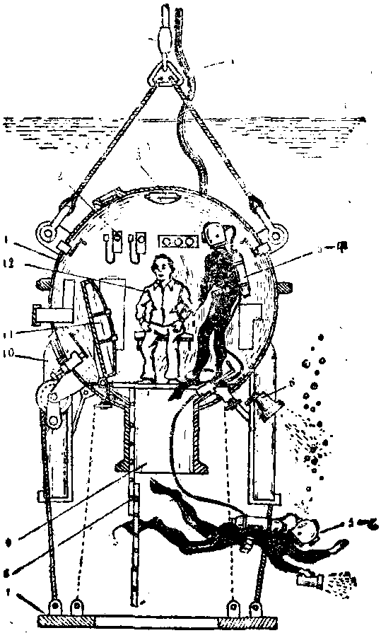 1-潜水舱; 2-通讯设备; 3-电灯;4-脐带; 5-甲潜水员; 5-乙潜水员;6-照转灯具; 7-压铁; 8-人梯; 9-人孔; 10-应急气瓶; 11-密封门; 12-照料人员。