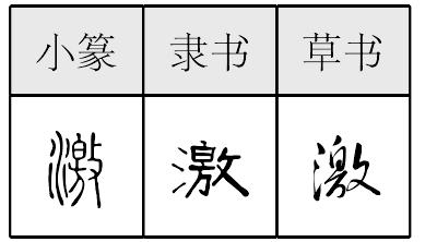 【提示】攵,4画,不要错写成3画的⼡。 白, 中间一横宋体与左右两边相接,楷体与左边相接,与右边相离。方,末笔是撇,不是横折钩。 *激jī16画 水部 (1) 水势受阻而腾涌飞溅: 江水~荡|一石~起千层浪|~起了一场风波(喻指引发事端)。 (2) 冲刷: ~浊扬清。 (3) 冷的液体或气体对身体突然造成刺激: 被雨~着了|凉水一~,醒了过来|冷风一~,打了个寒噤。 (4) 〈方〉 用冷水冲、泡食物使变凉: 把汽水放在冷水里~一~再喝。 (5) 急剧;猛烈: ~烈|~战|~增|过~。 (6) 刺激感情使冲动、奋发: ~发|~励|刺~|~将法。 (7) 感情亢奋冲动: ~动|感~|愤~|~于义愤。 激 ☚ 湍 洞 ☛ 激jī上古形声字。从氵(水),敫(jiào又yào,从白、放,照耀义)声。水势受阻而腾涌或飞溅。如:激起浪花。引申为使动,使人的感情冲动。如:用话激他。组词如:刺激|激昂。又引申为急剧的,强烈的。如:激变|激战|激烈。 激★常◎常
