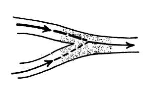 本法则由Cranefield于1971年提出。激动的相加首先需要传导纤维的一种特殊排列,即两支纤维汇集到一支纤维的解剖结构,这样在两支纤维内传导的激动如能同时抵达,从而在纤维汇合处相遇,就可相加而形成一个较强的激动,通过汇合纤维,如该汇合纤维的某一节段组织是受抑制的,则激动能否通过此抑制区,就取决于激动的强度。如激动能相加成一个较强的激动,就能通过该区(图A);如一个激动提前抵达,而不能相加,则这个提前抵达的激动就不能通过该抑制区(图B);如激动是从逆向通过此区则是激动的分散,结果造成阻滞(图C)。