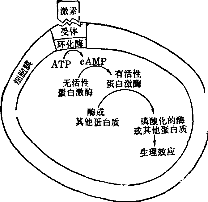 图1 激素通过细胞膜上受体的作用机理 1958年Sutherland首次从加肾上腺素或胰高糖素的肝匀浆中分离出cAMP,此物质系细胞膜中的腺苷酸环化酶作用于胞浆中的ATP所生成,胞浆中的磷酸二酯酶则催化cAMP的磷酸二酯键的水解,生成5′-腺苷酸而失活。腺苷酸环化酶存在于哺乳动物的所有组织细胞中 (成熟红细胞例外) 是细胞膜中的一种靠近内侧的嵌入蛋白质,它紧密地与靠近膜外侧的另一种嵌入蛋白质即激素的受体相联系。 以肾上腺素和胰高糖素对肝细胞和脂肪细胞的作用为例,其作用机理如图2、图3。 蛋白激酶是催化蛋白质(包括酶)发生磷酸化作用的一类酶,被催化的酶有的经磷酸化作用后从无活性变为有活性,如磷酸化酶b激酶和脂肪酶,但也有的酶经磷酸化作用后从有活性变为无活性,如糖原合成酶。