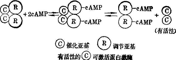 cAMP的生理作用 许多肽类激素均使细胞内cAMP升高,据目前所知,由于不同细胞内有不同的酶系,发生不同的生理作用。但首先cAMP将激活蛋白激酶,然后再激活一系列的磷酸化酶等而起作用。 (1) 蛋白激酶的激活过程:受cAMP激活的蛋白激酶又称cAMP依赖性蛋白激酶,由二个亚基组成,一是催化亚基,有催化蛋白质磷酸化作用,另一是调节亚基,是前者的抑制物。当此二亚基结合时,酶呈抑制状态。当cAMP和调节亚基结合,使催化亚基脱离时,起激活蛋白激酶作用(图1)。