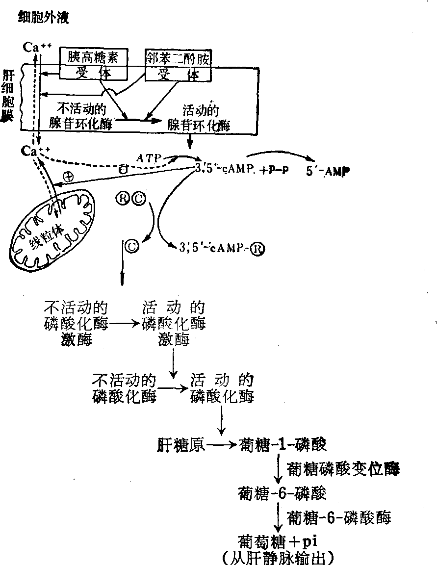因此,除前述cAMP学说外,还有cGMP学说,Ca++作为第二信使学说。cGMP广泛分布于很多组织,但其浓度较cAMP小数倍至数十倍。目前已认为cGMP是胆碱能神经M受体的突触后递质,可能和某些激素信息传递有关,如生长激素释放抑制激素似乎以cGMP为第二信使。胰岛素在降低肝和脂肪细胞中cAMP的同时,cGMP常升高,但此作用似有赖于Ca++的存在,故在胰岛素作用机理中cGMP作为第二信使的认识几乎已被否定。Ca++可促进磷酸化酶b激酶的活性,也可激活脂肪酶等,故有人提出作为某些肽类激素的第二信使,如胰岛素作用于靶细胞并不引起cAMP变化,而首先使膜上结合的Ca++发生置换,改变膜的稳定性,促进葡萄糖和钾离子等进入细胞内,同时抑制胞内Ca++外溢,导致细胞内Ca++上升,明显抑制蛋白激酶活性,继而促进磷酸化而发生生理作用,但此说也未被普遍接受。近年来尚有提示进入细胞内的肽类激素,已用电镜自动放射显影术证明,如胰岛素、催乳素、甲状旁腺激素、表皮生长因子等进入细胞内,起生物效应而后者可能直接作用于核。因此胰岛素不仅作用于细胞膜受体,促进葡萄糖等进入细胞与酶系活动,而且进入细胞内与核、内质网、高尔基体等结构结合,导致DNA、RNA和蛋白质等合成。目前胰岛素受体已知为糖蛋白,但其化学结构仅初步明确(类似免疫球蛋白),其作用机理等尚在研究中。 为了总结上述细胞膜上受体类型的多肽类作用机理,举胰高糖素为例以图2说明如下。