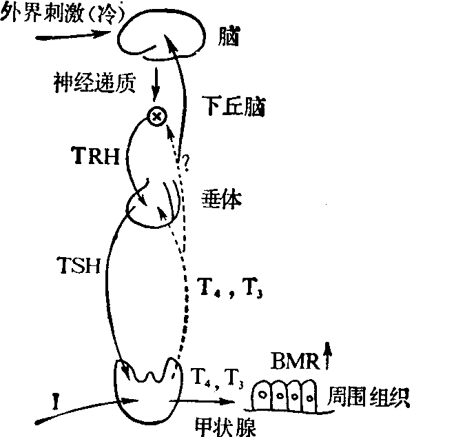 下丘脑-垂体-靶腺(甲状腺)轴直线示刺激,虚线示抑制