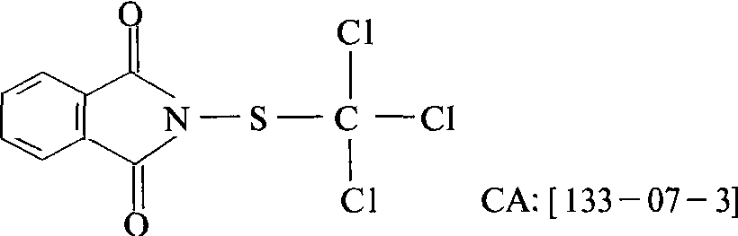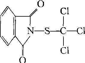 性能 纯品为白色晶体,熔点180℃ 。20℃时蒸气压<133. 32×10-5帕。室温下在水中溶解度仅1毫克/升,微溶于有机溶剂。干燥时稳定,遇水缓慢水解,遇高温或在碱性条件下则迅速水解。本品无腐蚀性,但其水解产物有腐蚀性。大鼠口服10000毫克/千克没有死亡; 大白兔急性经皮LD50>22600毫克/千克。工业品按10000毫克/千克饲喂大白鼠17个月,未见病变或肿瘤;用含100~ 1000毫克/千克药量食物喂大鼠,连续三代对繁殖无不良影响。对鱼有毒。对蜜蜂无毒。对粘膜有刺激性。本品对白粉菌(Erysiphe spp.),黑星病菌(Venturia spp. ),小丛壳菌(Glomerella spp.),盘长孢菌(Gloeosporium spp.),单丝壳菌(Sphaerotheca spp.),叉丝单囊壳菌(Podos-phaera spp.),霜霉菌(Peronospora spp.),交链孢菌(Alternaria spp.),疫霉菌(Phytophthora spp.),葡萄孢菌(Botrytis spp.)等都有活性. 应用 主要作喷雾使用。按0.1%左右浓度药液喷雾,防治瓜类、蔬菜、葡萄霜霉病、白粉病;马铃薯、番茄早疫病、晚疫病;苹果炭疽病、黑星病、白粉病;草莓等的灰霉病等。0.2%左右浓度药液,防治小麦白粉病、锈病、赤霉病和花生叶斑病、烟草炭疽病、小稻纹枯病等。用药剂量偏大时,梨、甜樱桃、桃和葡萄的一些品种易生药害。本品除不宜与强碱性药剂和油剂混用外,可与多数常用农药混用。已有若干复配制剂问世,如Trimifol(与铜盐复配),Mycodifol(与敌菌丹复配)等。 灭菌丹folpet三氯甲硫基类杀菌剂。化学名称:N-三氯甲硫基邻苯二甲酰亚胺。化学结构式如下。原药为白色结晶,难溶于水,微溶于有机溶剂,在干燥条件下稳定,碱性介质中分解。室温下遇水则缓慢水解而失效,并对金属有腐蚀作用。广谱性保护杀菌剂,可防治禾谷类作物、果树、蔬菜、茶树等多种作物病害,一般在发病前喷洒。还可用于蚕体防治蚕僵病。对人畜毒性低、大鼠口服急性LD50≥10 000mg/kg,对黏膜有轻微刺激作用。