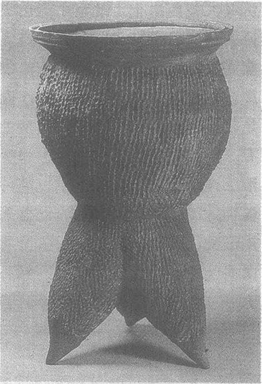 | 释义 | 灰陶甗 灰陶甗商。通高45厘米,口径28.5厘米。1953年河南省郑州市二里岗出土。北京中国历史博物馆藏。甗是蒸饭器,全器分上下两部分:上体称甑,用以盛米;下体称鬲,用以煮水,中间置箅可通气。此陶甗盘口较大,腹深而阔,束腰后接3个紧凑的袋状足,形状细长。束腰内的凸棱可以置箅。器外表通体饰粗犷的绳纹。这种式样的陶甗多见于二里岗上层灰坑,属于商代前期的遗物。