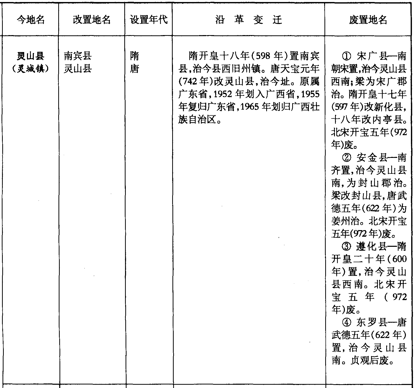 灵山县(灵城镇)南宾县灵山县隋唐隋开皇十八年(598年)置南宾县,治今县西旧州镇。唐天宝元年(742年)改灵山县,治今址。原属广东省,1952年划入广西省,1955年复归广东省,1965年划归广西壮族自治区。❶ 宋广县—南朝宋置,治今灵山县西南;梁为宋广郡治。隋开皇十七年(597年)改新化县,十八年改内亭县。北宋开宝五年(972年)废。❷ 安金县—南齐置,治今灵山县南,为封山郡治。梁改封山县,唐武德五年(622年)为姜州治。北宋开宝五年(972年)废。❸ 遵化县—隋开皇二十年(600年)置,治今灵山县西南。北宋开宝五年(972年)废。❹ 东罗县—唐武德五年(622年)置,治今灵山县南。贞观后废。