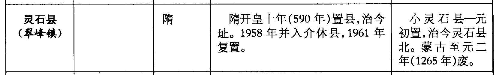 灵石县(翠峰镇)隋隋开皇十年(590年)置县,治今址。1958年并入介休县,1961年复置。小灵石县—元初置,治今灵石县北。蒙古至元二年(1265年)废。