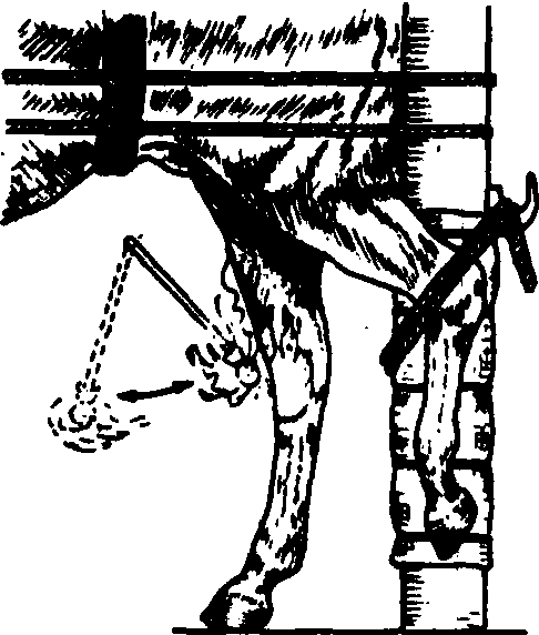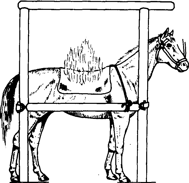 图2 酒灸法 软烧术 用酒燃的火苗直接烤燎患部的一种疗法。术前准备:❶制作烧灼棒。取圆木棒一根,长40厘米,直径1.5厘米。一端用棉花包套,外用纱布包扎,细铁丝拧紧,状似击鼓槌,槌头长约8厘米,直径6厘米。 ❷制备醋椒液。取食醋1 000毫升,花椒50克,混合煮沸数分钟,候温备用。患畜保定于柱栏内,将健肢保定妥当后,用毛刷蘸醋椒液,涂刷患部及周围上下,使被毛充分湿透。然后将烧灼棒棉球头用水浸透拧干,用注射器将白酒或酒精浇在棉球头上,点燃。术者手持烧灼棒用力左右来回甩动, 频率越快, 火苗越大, 使火苗甩成直线,用火苗烤燎患部及周围(切勿让棒球打碰患部)。开始火苗宜小,待患部皮肤温度逐渐升高以后, 再加大火力(即武火)。如此不时一人用毛刷蘸醋椒液洒湿术部被毛,以免烧焦; 一人持注射器不时向棒棉球头上加酒。连续烤燎30~40分钟(图3)。适用于慢性关节炎、屈腱炎、变形性关节炎、慢性腰胯风湿症等。注意切忌棒棉球头触碰皮肤, 否则造成严重烧伤; 术后注意保暖,适当牵遛。术后1~2天内跛行加剧,7~15天后,逐渐减轻或消失。若不愈, 一个月后, 可重复施术一次。
