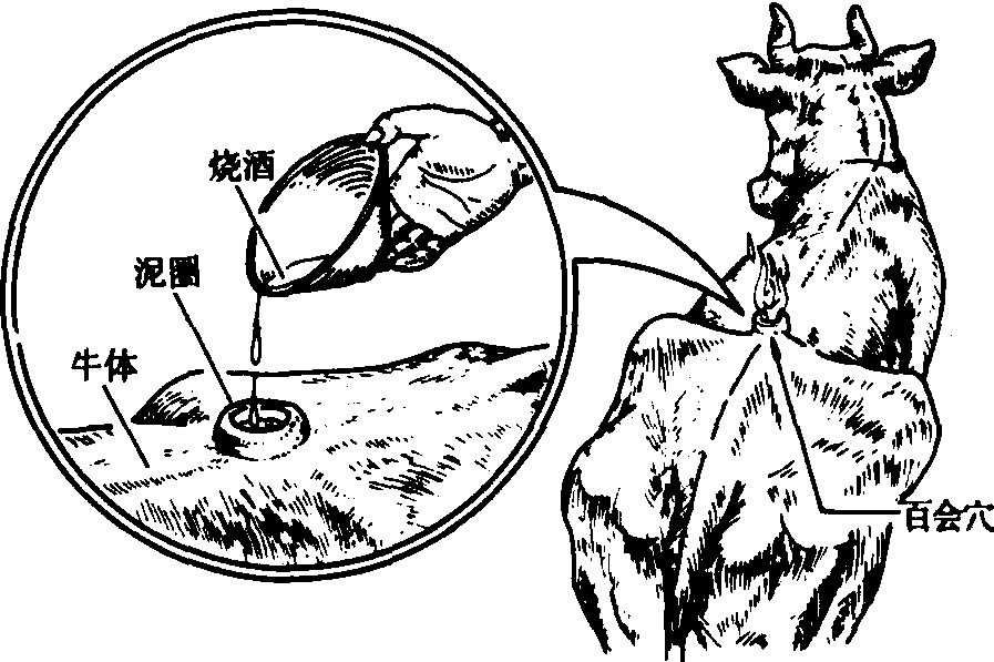 图1 醋酒灸(火烧战船) 醋麸灸 应用热醋拌麦麸搭于患部的一种灸熨疗法。准备麦麸5~10公斤,食醋3~4公斤。先将一半麦麸放在锅内,随炒随拌醋,醋加至手握麦麸成团,放手即散或不完全散,温度达40~60℃时,迅速装入大布袋内(袋长由 甲到肷部,宽由背向两侧下垂至大胯尖的水平线),搭于患畜背腰部,将袋内麦麸铺平。再用同法炒另一半麦麸。两袋交替搭换使用,稍冷即换。直至患畜耳根、腋下微微出汗。除去布袋,随即搭上双层干麻袋或衣被保暖,静养于暧厩内。注意勿受风寒。适用于腰胯风湿痹痛。酒灸法 点燃置于穴位上的面碗内的酒或酒精施灸的一种方法。把用面团捏成的面碗(边厚底薄或泥圈)粘着在穴位皮肤表面,将白酒或酒精加入面碗内,点燃,酒燃尽再加。每次灸20~30分钟(图2)。适用于腰胯风湿、寒伤腰胯痛。