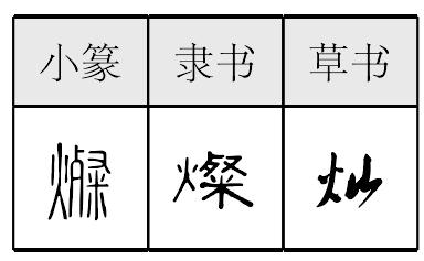 càn燦,形声,从火,粲(càn)声,光彩鲜明耀眼。近代俗字、《简化字表》简作“灿”,音符改为山。 |