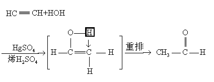 炔烃与水加成,先生成很不稳定的“烯醇式”化合物,即刻发生分子内重排,生成酮或乙醛 (乙炔水合产物为乙醛):
