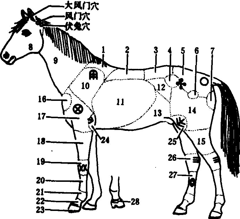 图1 伯乐画烙部位 1.鬌甲; 2. 背; 3. 腰; 4. 腰角; 5. 尻; 6.臗关节;7. 臀端; 8. 头; 9. 颈; 10. 肩; 11.胸廓; 12. 肷;13. 腹; 14. 股; 15. 胫; 16. 肩端; 17. 臂; 18. 前臂; 19. 腕; 20. 管(掌); 21. 球节; 22. 系; 23. 蹄;24. 肘端; 25. 后膝; 26.飞节; 27. 管(蹠);28. 蛾眉烙 注意事项: ❶烙铁烧成杏黄色为宜。火力过大烧成黄白色则容易烧焦皮肤; 火力过小烧成黑红色, 不仅达不到烧烙目的, 而且容易粘带皮肤造成烙伤。因此, 当烙铁温度降低时, 需及时更换。 ❷严禁重力按压皮肤和来回拉动运烙, 并且依次一遍遍烧烙。 ❸避开重要脏器, 勿损伤较大神经和血管。外伤、软肿、蹄冠、蹄球或皮肤较薄部位不宜画烙。 ❹画烙刚刚结束,勿令暴饮冷水, 需擦干汗液, 适当牵遛。 ❺保持画面干燥、清洁, 防止啃咬和感染化脓。 ❻若需再次烧烙,须在烙面愈合后进行, 且尽可能避开前次烙线。若患畜需多处画烙治疗, 可先择一处, 待烙面愈合后, 再烙他处。 ❼严冬、酷暑和大风、阴雨天气不宜施术。幼畜、衰老和妊娠后期患畜也不宜施术。本法多用于针药无效的慢性屈腱炎、慢性关节炎、骨瘤、肌肉萎缩、腰胯风湿和外周神经麻痹等的治疗。 熨烙法 用大型方形火红烙铁熨烙覆盖在穴位或患部皮肤上的浸醋纱布棉垫的一种烧烙方法。又叫间接烧烙法。术前准备与画烙法大致相同, 但须事先制备大小适宜的纱布棉垫(或用毛巾代替)和大型方形烙铁2把。妥善保定患畜。将纱布棉垫敷于施术部, 稍加固定, 喷洒温醋使之浸透。术者手持火红烙铁, 在覆盖的纱布棉垫上, 缓缓熨烙。开始宜轻熨, 以后逐渐加重。烙铁不热及时更换,并不断向棉垫上加醋,勿让垫干烧焦。如此,烙至手触术部皮肤有温热感, 或周围皮肤微汗,大约需10分钟。移去纱布棉垫, 改用干布敷盖,稍加固定(图2)。若不愈, 一星期后, 可再施术。