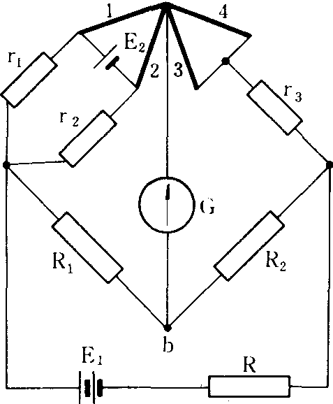 图 1 直热式热线风速表(不平衡电桥)原理示意图 固定电流法 固定加热电流,根据RT的变化情况决定风速大小。一般用不平衡电桥原理工作。线路同图1,G不作为平衡指示器而是用来指示风速。工作时保持电流不变, 由于风速影响,RT因温度降低而减小,电桥失去平衡, G中电流大小即可指示风速。这种方法同样存在气温变化和太阳辐射影响所形成的误差。可以用图2的线路较好地解决这个问题。图2中1、2、3、4是四根特性完全相同的铂丝,r1、r2、r3的电阻,γ1=γ2=2γ3。E2主要用作铂丝1、2加热的电源,铂丝1和2用于测风,3和4主要用来补偿气温的变化。工作时1、2、3、4全暴露在空气中。当v=0时, 电桥处于平衡状态,不论外界气温如何变化,都不能改变,对气温起到了补偿作用。风速改变后, G不会受太阳辐射和气温变化的影响。