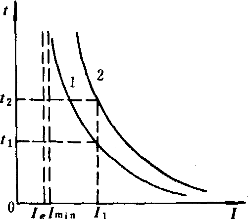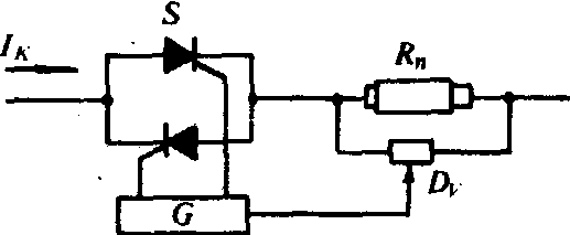 图3 熔断器安秒特性 1.熔体截面小; 2.熔体截面大 熔体熔断时间与通过电流的关系称为熔断器安秒特性,也称保护特性(图3)。通过熔体的电流愈小,熔断时间愈长。当电流减小到某一数值时,熔断时间趋向无穷大,该电流称为最小熔断电流Imin。熔体的额定电流Ie一般为80~85% Imin,熔体可在额定电流下长期可靠地工作。 保护电路的熔体额定电流按下列原则选择: ❶在照明电路及其他要求保护过负荷的电路内应满足IeRt≥Ifm,或IeRt=IQ/2.5~3,式中IeRt为熔体额定电流(安);Ifm为最大负荷电流(安);IQ为电动机启动电流(安)。 ❷在单台异步电动机供电线路内熔体不保护过负荷仅保护短路, 熔体额定电流IeRt应满足IeRt=(1.5~2.5)Ide,式中Ide为电动机额定电流(安)。 ❸多台异步电动机的供电线路,熔体额定电流应满足 式中Idem为容量最大的电动机的额定电流(安); Idei为电路中其余电动机额定电流之和(安)。❹配电变压器低压侧总熔断器熔体的额定电流应满足1.3 Ieb>IeRt≥Iebo式中Ieb为变压器装熔断器侧的额定电流(安)。 ❺保护35千伏及以下变压器的高压熔断器,其熔体额定电流应满足IeRt=KIbgm。式中Ibgm为变压器回路的最大工作电流(安);K为安全系数,不计电动机自启动时K=1.1~1.3,考虑电动机自启动时K=1.5~2.0;当10千伏配电变压器容量为125千伏安及以下时K=2~3,且IeRt不宜小于5安。 ❻对保护电力电容器的高压熔断器,其熔体额定电流应满足IeRt=KIec。式中Iec为电容器额定电流(安);K为可靠系数,对于限流式熔断器保护单台电容器K=1.5~2.0,保护一组电容器K=1.3~1.8, 对于跌落式熔断器K=1.2~1.3。 ❼熔断器动作应有选择性,在同级电压电路中,由故障点到电源点,熔体额定电流应逐级加大。 熔断器的选择应满足下列条件: ❶熔断器的额定电压必须等于或小于所在电网的额定电压。但充填绝缘砂粒的熔断器,只能用于额定电压相同的电网。 ❷熔断器额定电流必须大于或等于熔体的额定电流。 ❸熔断器的极限开断电流应满足IeRd≥Icj或IeRd≥I″,式中IeRd为熔断器极限开断电流;Icj为最大计算冲击短路电流有效值(用于非限流式熔断器);I″为最大计算三相短路次暂态电流有效值(用于限流式熔断器)。 自复熔断器是一种开断能力较强的新型熔断器,将熔体金属钠密封在专门结构的管内而构成。当大电流通过时钠被气化,变成高压高温的汽体,其高电阻具有很强的限流作用,使电路断开。当限流作用结束后,金属钠又恢复成固体,使熔断器两端重新接通。它的用途有: ❶与小断流容量自动开关串联组成有限流作用,且断流能力高的保护电器。 ❷与电磁式接触器配合实现短路保护。 ❸与电力半导体元件配合直接保护电力半导体元件。 ❹与半导体元件组成无触点固体断路器(图4)。当大电流IK通过固体断路器时,自复熔断器Rn很快动作,检察器Dv立刻向触发器G发出信号,使可控硅S关断,电路断开。在自复熔断器基础上有的国家已研究能单独反复使用的熔断器。这种熔断器在限流过程结束,限流熔体材料固化后不能接通电路,需靠外力机构(如电磁铁)动作,挤压限流材料,使之充满电极间的空腔,电路才能接通。