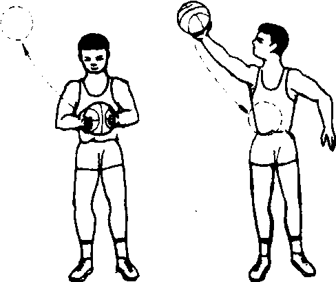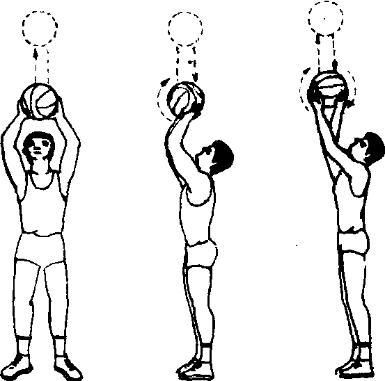 双手头上抖腕、传接球 两脚左右开立,两臂上举过头,手心朝上持球,然后利用抖腕力量向上传球,并使其向后旋转;球下落时,手心朝上接球并立即抖腕作传球。 单手头上抖腕、传接球 两脚左右开立,右(左)腕微屈托球于头上,左(右)手扶球抖腕将球向上传出;球下落时,右(左)手接球并立即仰腕托球再抖腕向上传球。 单手体前左右挥摆球 两脚左右开立,两手持球于胸前,左手将球推交右手,右手持球向右侧挥摆,当右臂伸直时迅速屈腕勾手将球挥至胸前,再推交左手。左右手交替练习。 单手体前斜上方挥摆球 两脚左右开立,双手持球于腹前,左手将球送交给右手,右手向右斜上方挥摆至球于最高点再勾手将球抄回,左、右手交替进行。