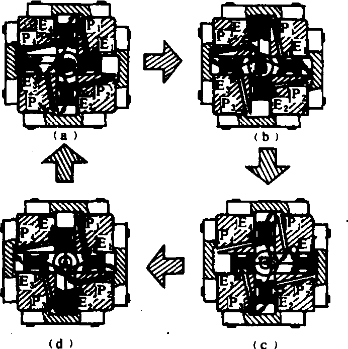 活塞式 主要用于车辆在运动及负载状态下瞬时或累计燃油消耗量的测量,由计量器和检测装置两部分组成。计量器主要部件为活塞、缸筒等。活塞往复运动一次并与阀门配合完成吸油和排油行程,把一定容积的燃油送至出口端。通过计量活塞的泵油行程便可测得耗油量。在实际应用中,常常由若干副活塞和缸筒并联工作,以减少燃油流动过程的脉动,提高测量精度。4个活塞计量器的动作过程如图。图(a)表示从人口来的燃油导入曲轴箱,并通过P3进入下侧的活塞室。这时上部活塞室与P1导通,从排油口E1排油,在下部活塞作用下曲轴顺时针旋转。图(b)为曲轴转至最高点时,P4和曲轴室导通,左侧活塞室进油,上部活塞泵油行程结束,右侧活塞处于泵油状态。图(c)为曲柄转至右端,右侧活塞的泵油行程结束,下部活塞处于泵油状态。图(d)为曲柄位于最下端,重复上述过程。排出油量由检测装置进行数字显示或通过频率电压变换进行模拟显示。 随着新技术的发展,容积式燃油油耗仪在结构设计和测量精度方面有了较大的改进和提高。如将油杯中定量燃油耗尽前后的油压变化量,利用硅压阻式半导体压力传感器转化为电压信号,配以二次仪表或计算机,可组成具有油量设定、时间设定、瞬时油耗和累计油耗显示、打印记录等多种功能和测量精度高的自动计量燃油油耗仪。
