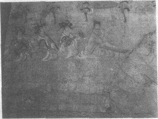 十六国·北凉。甘肃省酒泉市丁家闸5号墓前室壁画。1977年发掘。燕居行乐图是全墓壁画中最精彩的部分。画面右侧绘一朱屋,青瓦、正脊、单檐、无墙。墓主人头戴三梁进贤冠,身着交领长袍,手持尘尾,端坐于椅上观赏歌舞。身后立男女侍从,侍女手持方形曲柄华盖,男侍双手捧一物。画面中部绘一方案,上置樽、勺,案下有温酒器,案旁立男侍。画面左侧为宴乐场面。在乐伎伴奏下,一舞伎双手各持一便面,双脚跨开,回旋而舞。另一舞伎作曲腿造型,应拍击掌,回首且歌且舞。舞伎的一侧为乐伎,第一位戴帻男乐伎,手抚箜篌,其身后的三位均为女乐伎,头挽三髻,身着长裙,分别奏琵琶、吹箫、拍腰鼓。伎乐的下方为百戏,在铺席的地上,两位女伎双手撑地倒立,腰肢十分柔软。整个画面布局合理,疏密相间,人物神情的刻划,衣纹、身姿的描绘都较东汉有了长足的进步。画面以墨线勾描为主,运笔粗细多变,弧线流畅,直线浑厚,在一些主要部位又用朱砂、石绿、石黄等色,使画面色彩不觉单调,可称为十六国时期墓室壁画的代表作。
